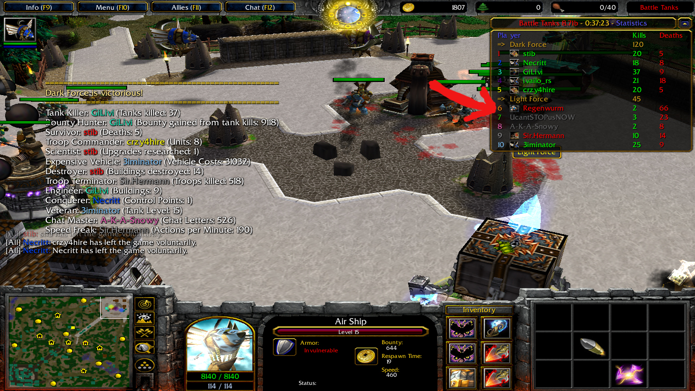 BTW: Really funny to see is how often player 7 and 8 are trying to kick or give-up^^ And I also think, that the commands ´´ -kick afk`` or ´´-kick Regenwurm`` or ´´-votekick afk Regenwurm`` are interesting possibilities for a kick-system^^