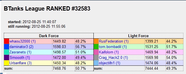 High Elo "Pros": These are the guys whose name everybody recognizes when they enter a ranked game, I'd say about 30% of players can be classified as this. These guys often end up going on the side lanes (whether they like it or not). They will rarely have a negative k/d and often end up with effort values of 1.00 or .15. These guys often end up being the "carries" in btanks and usually are the first players to get tanks. They also have good map awareness and teamplay. The most often case is that there are two of these players in a game and they end up on opposite teams and most often opposite sides of the same side lane. Their elo ranges from 1550-1700 (to include the very best, most peak at 1600) and rarely drops below 1550. Middle Elo "Average Players": I'd say they make up usually about 60% of a game's players and most have over 100 games of experience. These players usually play in the middle, but CAN lane if nessecary though not at the same level as the high elo players (usually only choosing to if nobody else is there). Sometimes these players are dedicated lane soloists , however what seperates them from the high elo pros is that high elo pros will remain dominant all game, where an an average lane soloist will eventually equalize with his teammates (due to lack of experience and teamplay). These players recognize the "need" to save, and have "big tanks" by around the 1:00 mark (which imo seperates them from the "bad" players) and often end up either getting upgrades for the carry or having the tank, often alongside the carry but with less weapons. These guys range all the way from 1450-1550, but they will usually be in the low 1500s. Low Elo "Bad Players": These are the guys you just don't want on your team, I'd say they're about 10% of players. They rarely speak at all and often have zero teamplay. They almost never buy the big tanks, often buying many expensive weapons on the midgame tanks, and then when they do it will always be long after everyone else has taken a big tank (and sometimes they will even take frost robot ). Sometimes they go to lanes, often without saying anything, and ruin the game early on by feeding. They usually have low elo below 1450 (and sometimes if their really bad below 1400) and end usually end up with the purpose of being an iron ball attached to the leg of a High Elo player. The real problem with these people is like progg mentioned, occassionally they will join a ranked game with a new account and severely unbalance the game with 1500 elo.It's better to look at teams based on these 3 groups to determine balance and not simply elo alone. Of course a bot can't do that, but as an observer you can really see the balance of the game more clearly like this.