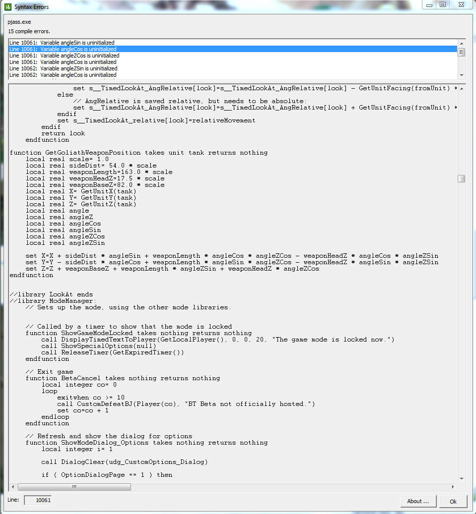 Hey guys, after a long time I decided to give the mapping in Warcraft 3 another try. When i began, the JNGP didn't worked with the updated version of the worldeditor, so i decided to swap to the other option Exodus mentioned, the Wex Editor. But once again i have a problem with it. I tried to troubleshoot atleast a littel bit, and i figured out why the map isn't shown ingame, the pjass.exe and the Jesshelper weren't working so i had to run them manually and uncheck the ''ask before open this file'', so i atleast have a real error report when i try to save the Map. So i atleast know now, that theres something wrong. When i try to save the map ( no matter if i actually change something) everything seems good to the point where Jasshelper says ''Structs writing'', then it tells me there is a pjass error. it opens a Window then titled Syntax Errors where it says that it finds 15 compile errors, they all say that there is a variable uninitialised like angleZsin,angleZCos and min DistNr so it seems like it is something with camera settings, but I'm a Noob in programming so I'm not sure. The thing that confuses me is, that this only happens in the 8.80c version, not in the 8.63 (I am 100% sure that both are open source and the right files, both show up ingame as open source before modding, afterwards the 8.63 works fine, the 8.80c shows up but there is no option to fill the slots with bots/start the game). After saving the Editor jsut says ''Unable to save the map'' and then continues letting me edit it, but when i close the editor then, the map is a little bit smallre then before, normally its 2457 KB, afterwards 2427KB, so there is something missing.. I hope anyone has an idea what could cause this problem, if needed i can upload a video/screenshots of the process saving so you can see detailed what happens, but maybe anyone already expirienced something like this and know a quick fix
