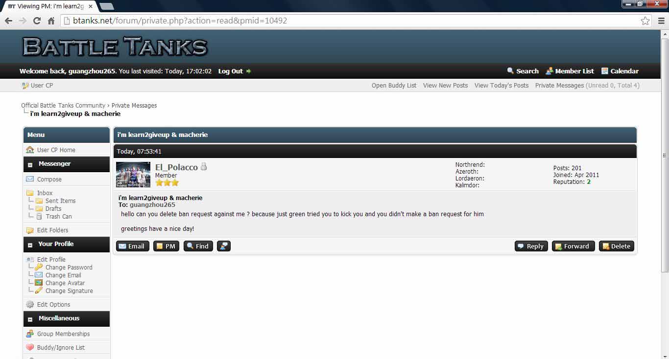 Today is the seond time for above players to no reason kick me , before their kick , I played normal and no and feeding , these two player said giveup at start because I with them at the same team and then kick me again , in my post #321 replay , LearN2GIveuP instigate my teamate kick me because he said that will get high kick recond in the game system , then I will be ban , this is why LearN2GIveuPevery game kick me reason , and today I receive his two pm , said want me to del the ban request ! I beleive the btanks game is the fun for every players , but for above two players use the discrimination for other players , I think really not fair for me , so this is the reason why I post twice for LearN2GIveuP again , thanks for the admin sepnd the time to read that !