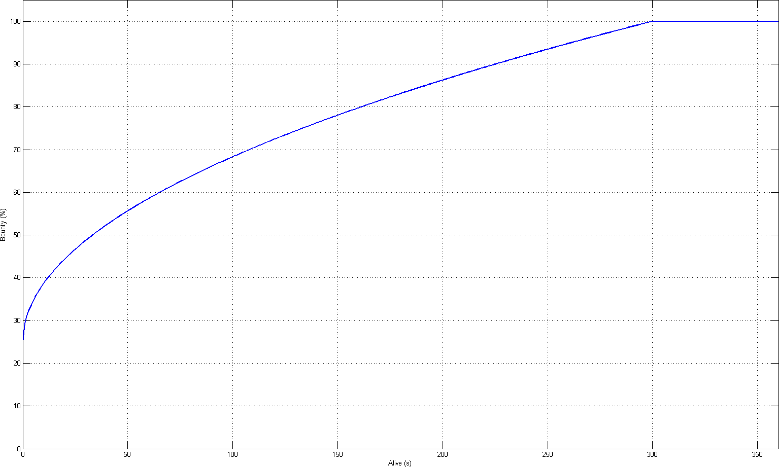 This means, a player dying exactly every 5 minutes won't give any more bounty in total than a player dying every 30 seconds. Stronger players who didn't die for 5 minutes will have a constant bounty from that time, so that they do not necessarily give the same amount of money to their enemies. Reaching that point may also encourage a player to be even more careful, since in the timer over 5 minutes he saves money for his team in every second. Besides that, the attackers may focus on stronger players to get more money from them, too, maybe even teaming up to prevent a player from reaching the 5 minute mark.